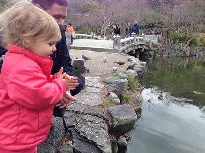 Our destination was Yasaka Shrine, where we strolled through the buildings and continued on to Maruyama Park just behind the shrine. It had been recommended as a good stop for kids, and didn’t disappoint. Ren peered closely into the pond looking for fish, and was thrilled when Adam showed her that if you clap they come. The pigeons were also a big hit, and she chased them in her funny stuttering way back and forth over a little bridge. Luckily, Ren didn’t fall in, and no pigeons or fish were harmed in her delight.