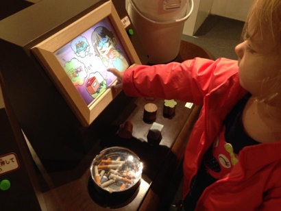 The best button pushing experience was in the pretend house, where you pressed buttons next to mirrors which then showed you the danger associated with the scene you were standing next to (baby could fall out of a drop side crib, boy could fall out of an open window). My favorite was this one: child may eat cigarette butts thinking they are candy, and be sad (as translated by Ren).