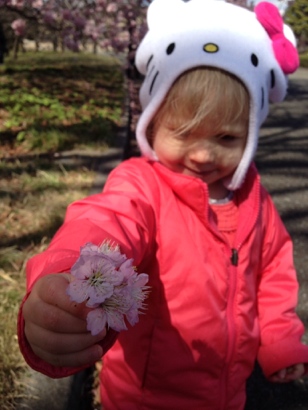 The flight yesterday went really well, and she charmed everyone on the plane and in the airport yesterday with her clownfish backpack. She was consistently greeted with “Nemo…kawaii!” She was in great spirits. Today she’s been making friends with her Hello Kitty hat on. I think Japan was made for adorable two year olds.