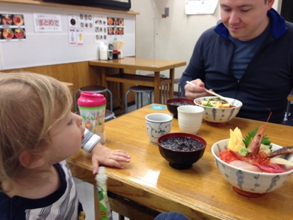 Strolled around in a drizzle, dodging carts and trucks (it is a very busy area, and clearly a hard working market!), and spent most of our time in the Outside Market, which is stall after stall of fish, vegetables, restaurant supply stores, and tiny restaurants serving the freshest sushi. Had to take advantage of that, so once Ren woke up, we headed back to the one that had seemed the friendliest. The ground floor was packed, but the man outside waved us in, shouting orders to the people inside. They whisked us up a flight of stairs, to a tiny room with four tables. Very friendly people, colorful picture menu, and we both ordered miso soup and a chirashi bowl (rice with sashimi on top). Grant stuck to tamago, tuna, salmon, and minced fatty tuna (which Ren declared yummy), and I got a bit more adventurous with salmon,albacore, tuna, shrimp, sea cucumber?, and salmon roe (ikura). The biggest surprise and hit of the day for Ren was ikura, aka bubbles. She ate almost all of them (probably 3-4 healthy spoonfuls), along with a nice amount of the fatty tuna and two-thirds of my salmon. The restaurant loved her, and brought her a little teddy on a stick, and several people stopped by to say hi to her. She must feel like a rock star.