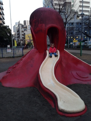 We made some new friends on a local playground this afternoon. The centerpiece of the playground was an octopus, where you climbed up the suckers and slid down his tentacles. I’d import this idea!