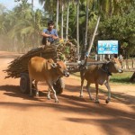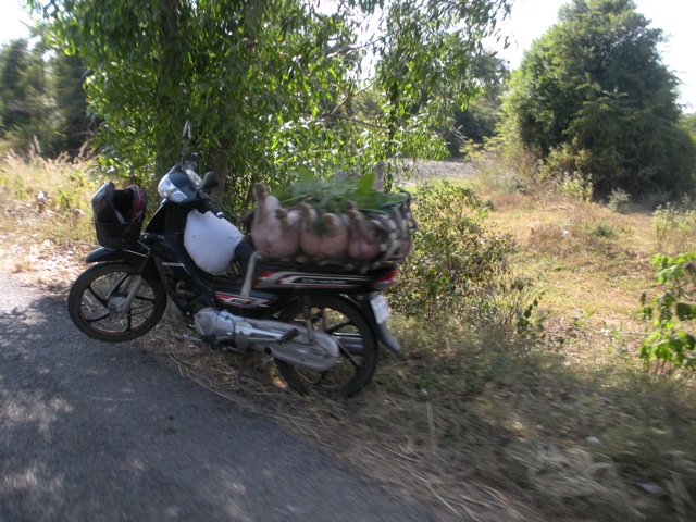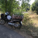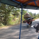 Bigger is a relative term in a country where six people can ride on a motorbike together, and it’s not unusual to see an enormous load strapped to a tiny vehicle. Anything with wheels that can be propelled by horsepower, manpower, or cowpower goes, and we saw it all! Pigs and chickens headed to market, whole families on a single motorbike, vans stuffed to overflowing with luggage and so many passengers that even the driver was sharing his seat and there were people seated on the roofs!