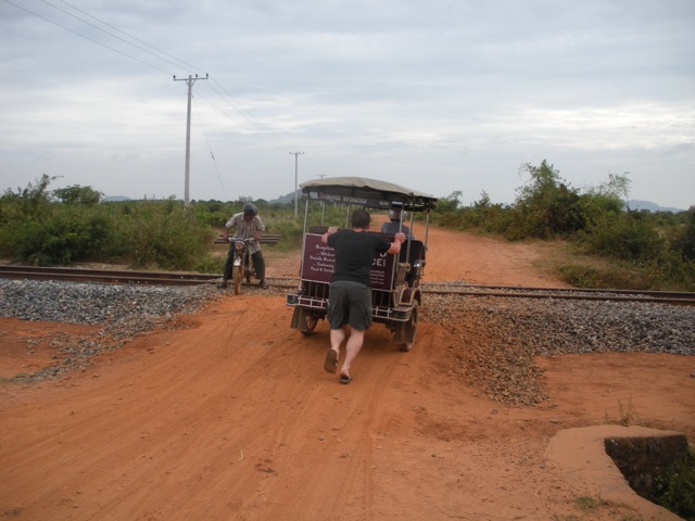 In Kampot, we went on a countryside tour via tuk-tuk to the salt fields, limestone cave, the beach and Crab Market at Kep, and to a pepper plantation. Also an interesting drive, especially when we had to get out every time we crossed railroad tracks for Grant to help push the tuk-tuk over. Needless to say, we didn’t call this driver Speed Racer, and we were a little concerned about the amount of gas puddling below his bike when we stopped.